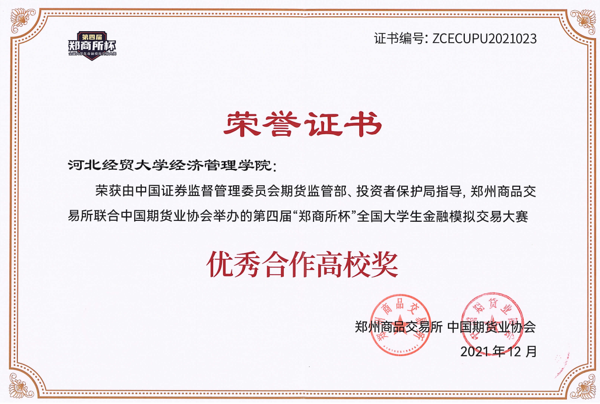 Beat365官网荣获第四届“郑商所杯”全国大学生金融模拟交易大赛优秀合作高校奖