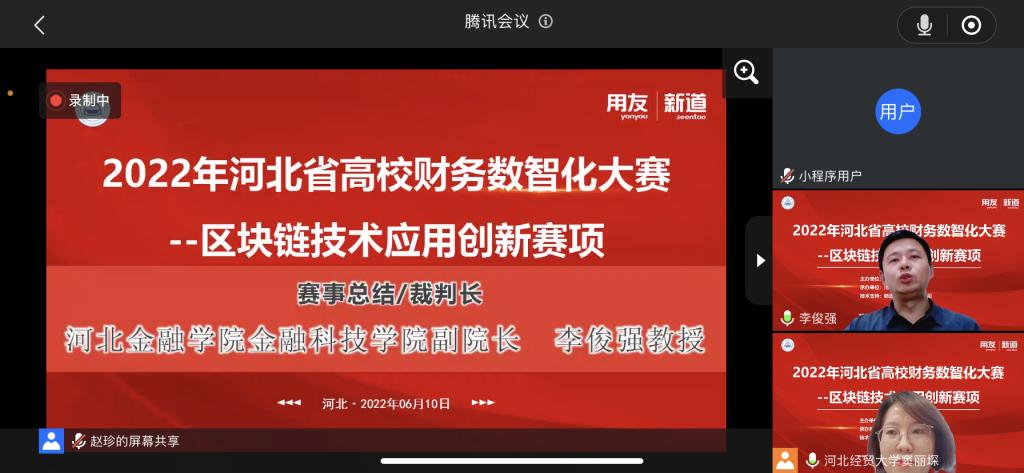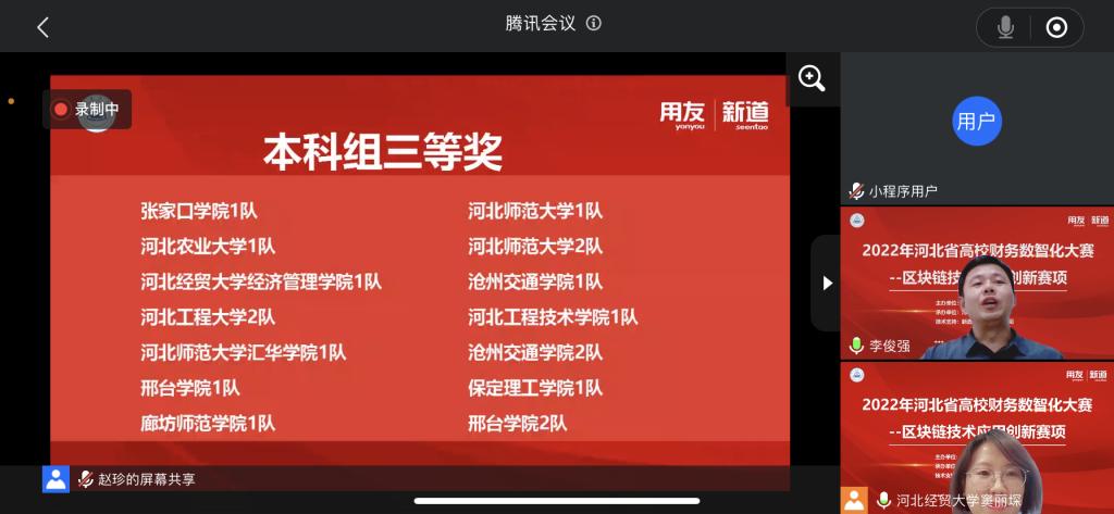 本次区块链技术应用创新赛项由河北经贸大学承办,新道科技股份有限公司协办。大赛侧重培养大学生的区块链思维,正确理解区块链概念、技术、产业应用和创新等,能够正确识别区块链(联盟链)应用场景具备正确规划联盟链的目标、角色、业务流程和智能合约设计的能力,对新形势下财务数智化人才的培养起到了推动作用。本次大赛共评出一等奖5项,二等奖9项,三等奖14项。来自河北大学、河北师范大学、河北农业大学、河北地质大学等省内46支本科组参赛团队参加了本次比赛。