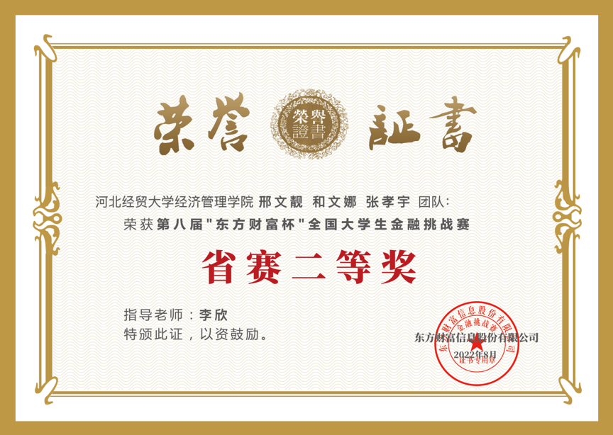 近日,第八届“东方财富杯”全国大学生金融挑战赛圆满落幕。经过三个月的激烈比拼,Beat365官网代表队最终获得省赛一等奖1项、二等奖3项、三等奖5项,参赛成绩创历年新高。