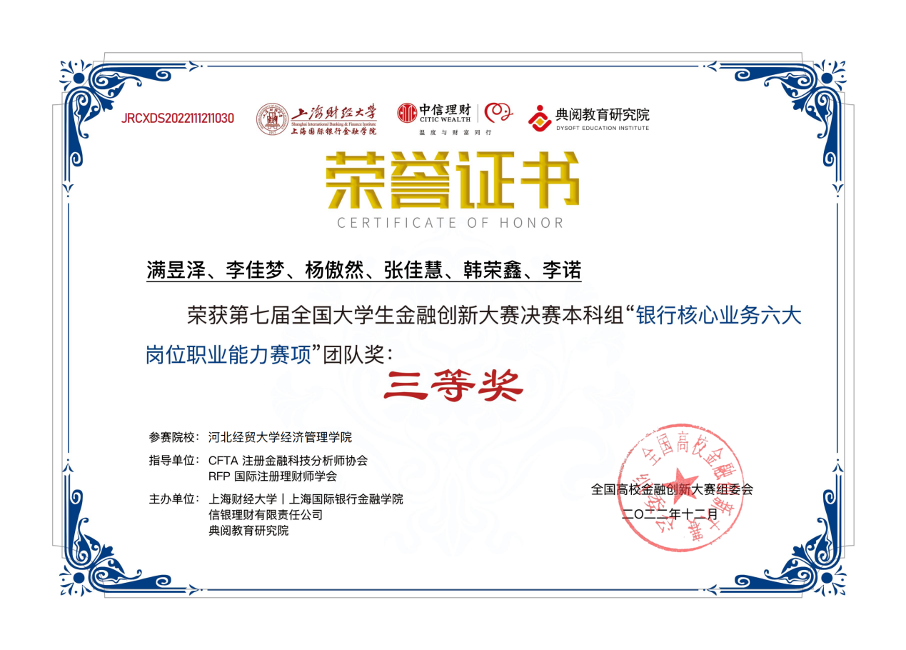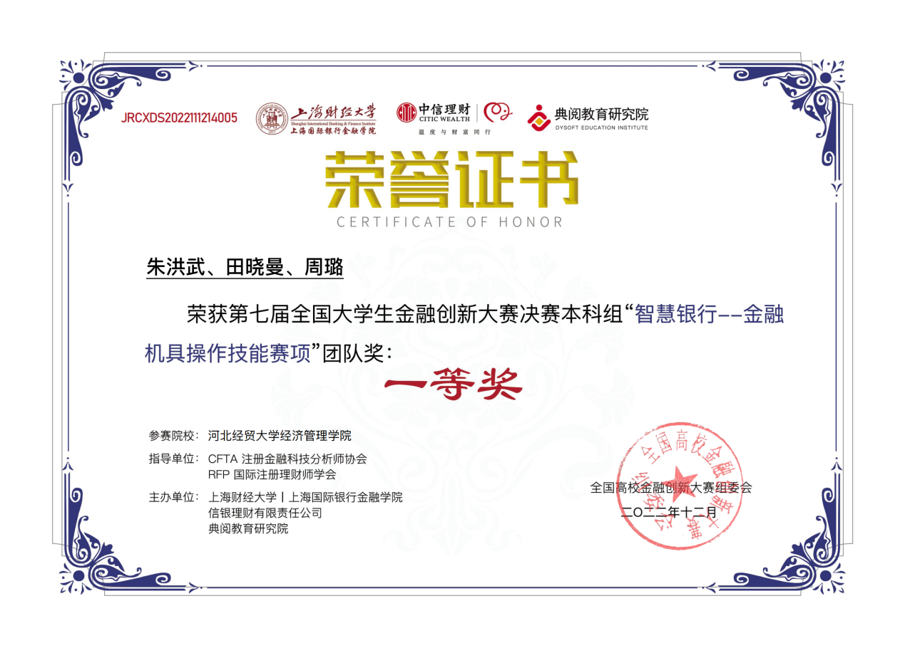 202211月由上海财经大学、上海国际银行金融学院、中信集团-信银理财、典阅教育研究院主办的第七届全国大学生金融创新大赛圆满落幕。Beat365官网经济系首次组队参赛,周璐、朱洪武、田晓曼同学荣获智慧银行银行-金融机具操作技能赛项团体一等奖、满昱泽、李佳梦、杨傲然、韩荣鑫、李诺、张佳慧荣获银行核心业务六大岗位职业能力赛项团体三等奖。郑庆国、贾红玉老师被评选为优秀指导老师。