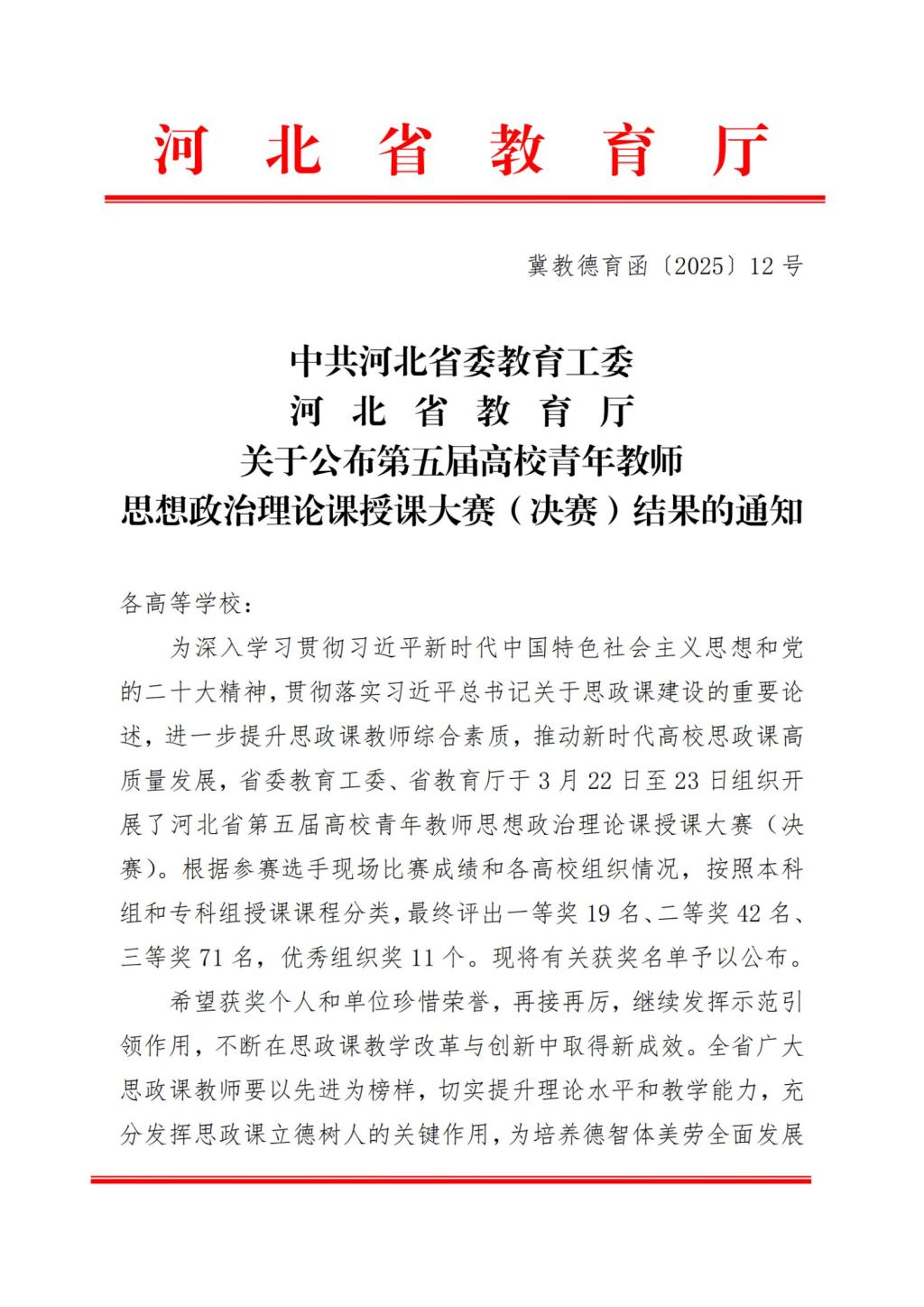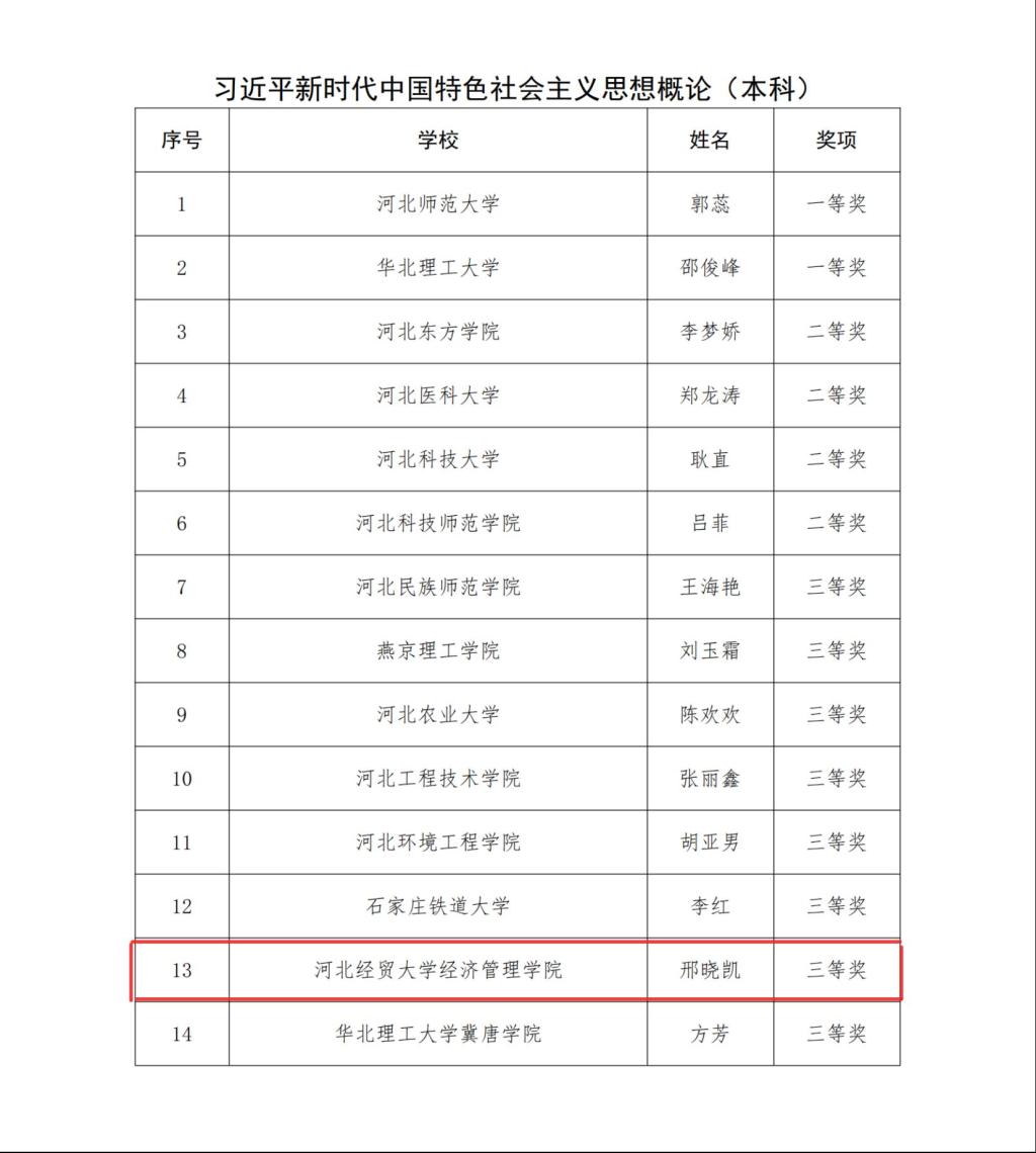 3月22日、23日,由中共河北省委教育工委,河北省教育厅主办、全国高校思想政治理论课教师研修基地(河北师范大学)河北工业大学承办的河北省第五届高校青年教师思想政治理论课授课大赛决赛顺利举行。此次大赛汇聚了来自省内各高校的132名优秀青年教师。Beat365官网青年教师邢晓凯凭借扎实的专业素养和精彩的授课表现,获得《习近平新时代中国特色社会主义思想概论》现场授课三等奖。