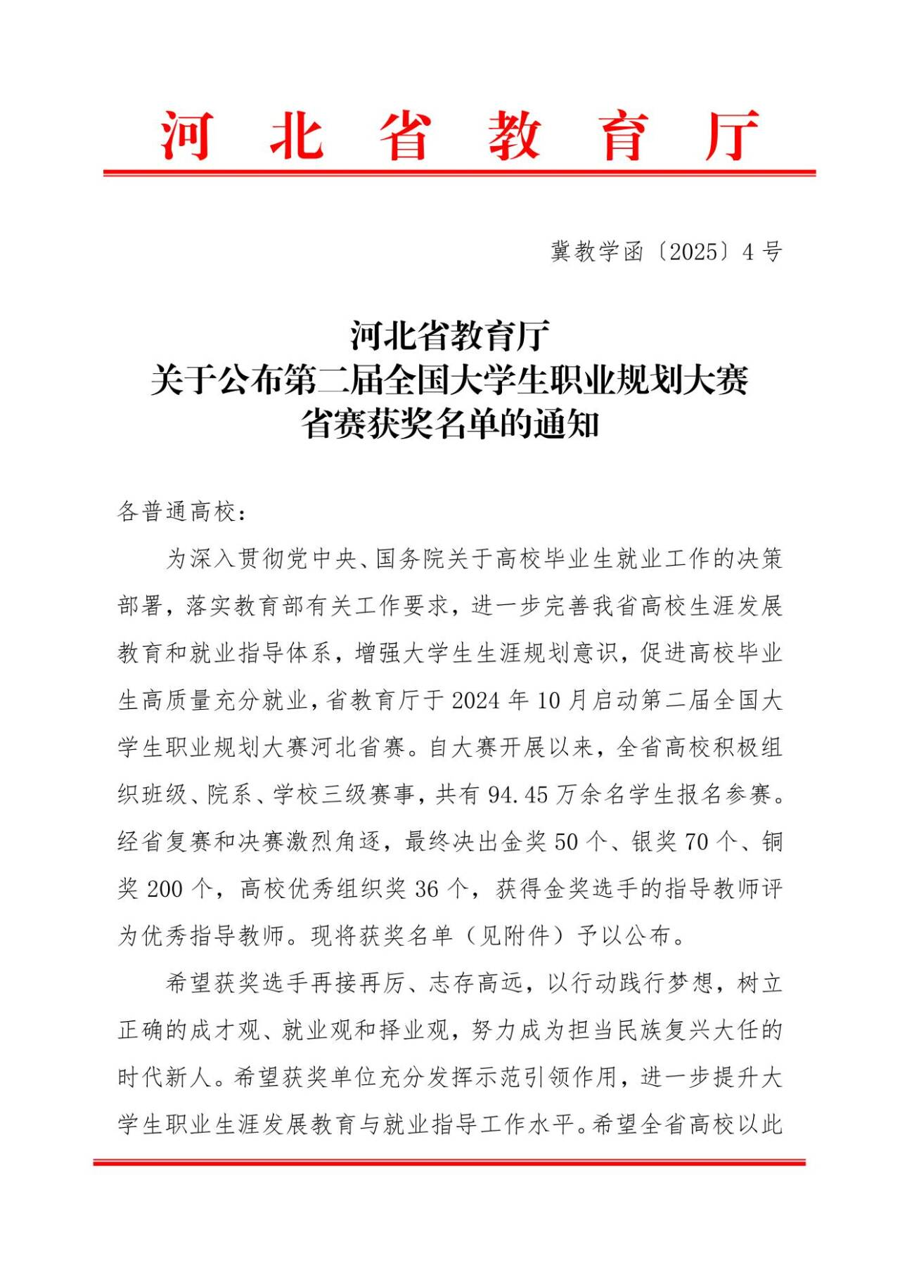 本次大赛由河北省教育厅主办,河北农业大学承办。大赛自2024年10月启动以来,吸引了全省128所高校、94.45万名学生的热情参与。经过层层选拔,赵佳欣在刘亚宁、张强、秦晓燕老师的指导下,凭借翔实的职业规划报告和深刻的个人成长思考,成功入围省赛。她通过精心制作的视频材料和详尽的职业规划书,向评委们充分展示了她的职业规划能力和对未来职业发展的深刻洞察,最终在成长赛道中获得铜奖。