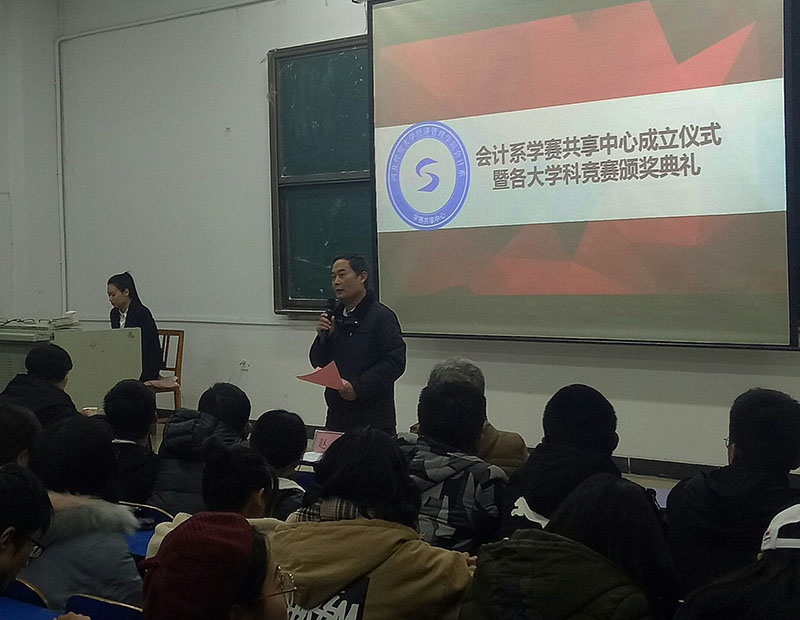 1月3日,会计系在西校区阶梯教室举行了学赛共享中心成立仪式暨高层次学科竞赛颁奖典礼。学院副院长赵宇、实践教学部部长张风海、副部长柳冬青、会计系党总支书记蔡杨、主任王慧霞出席活动,会计系270名同学参加。
