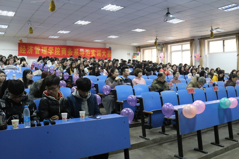 12月15日,商务系旅游管理专业在二教105举办2017年导游实训大赛,实践教学部部长张风海、旅游学院教授佟蔚老师、商务系主任张学引、商务系辅导员郑婷老师以及14级旅游管理一班嘉宾出席并担任大赛评委,200余名学生代表观看比赛。
