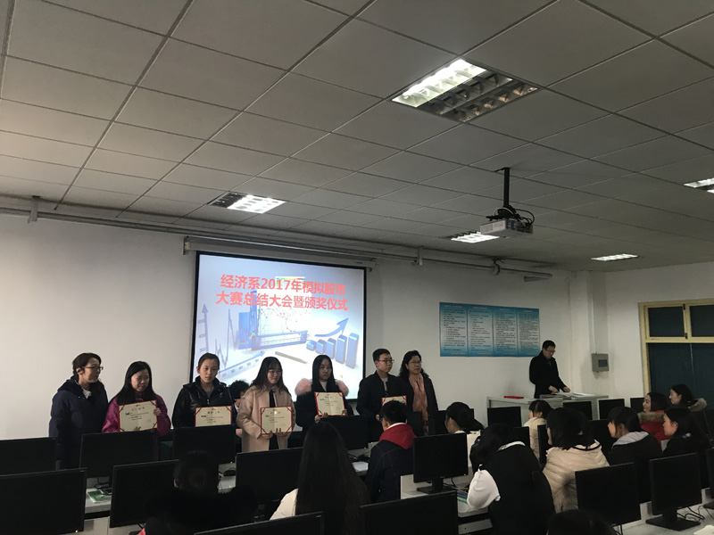 11月27日,经济系2017年模拟股市大赛总结大会暨颁奖仪式在南院三教502举办。实践教学部副部长柳冬青、经济系书记郑学栋、主任张玲芝出席总结会并为获奖同学颁奖,100余名学生参加了会议。