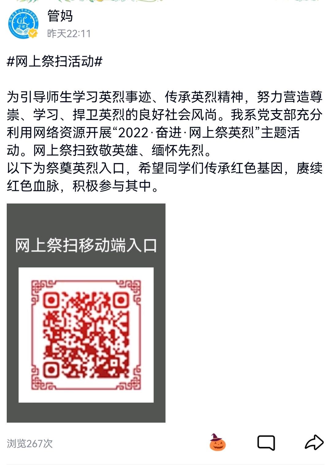 管理系通过支部群、黑板报、“管妈空间”等形式动员学生参与此次活动,并将活动与党史学习教育相结合,通过自主观看英烈故事视频,主动学习党史知识,进一步增强了自身的使命感、方向感、紧迫感;学生党支部利用网上祭扫平台为烈士敬献花篮、鞠躬,同时写下对烈士的寄语以寄托哀思、缅怀先人。