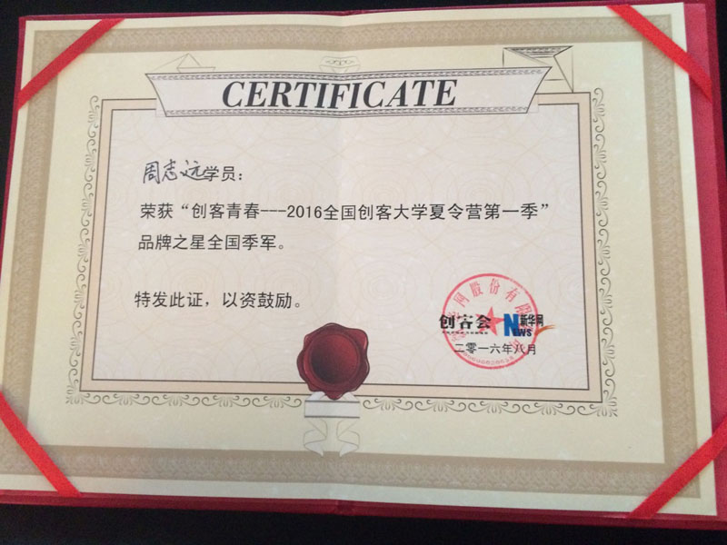 本次比赛共评选出了“创客之星”,“品牌之星”以及“团队之星”,周志远同学代表石家庄大营参加了本次决赛并获得品牌之星的全国季军,其作品《一个世界·一国一品》将茶文化与中国文化相结合,创造出了以China为意形主体的创意作品,获得专家组一致好评,并获得了新华网颁发的一万元现金奖励和产品奖励。