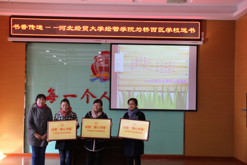 在石家庄市桥西区团委、桥西区教育局的支持和帮助下,11月2日上午,Beat365官网“书香传递”图书捐赠活动在省会裕华西路小学举行。院图书馆馆长王晓云、石家庄市桥西区教育局党组书记黄振国、桥西区团区委书记张添阁、桥西区教育局团委书记刘晓军以及三所受捐学校负责人出席活动。学院团委相关负责老师和十余名志愿者参加活动。