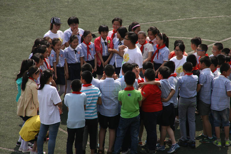 刚进入中华南大街小学,志愿者便受到300余名孩子们的热烈欢迎。大家蹲下身来与孩子们进行交流,瞬间拉近了心灵的距离。孩子们争先恐后的向志愿者们倾诉着心声。随后,在大家好奇与期盼的目光中,志愿者将孩子们分为六个组,大手拉小手一起表演了欢快的开场舞蹈,互动连连,整个场面和谐融洽。