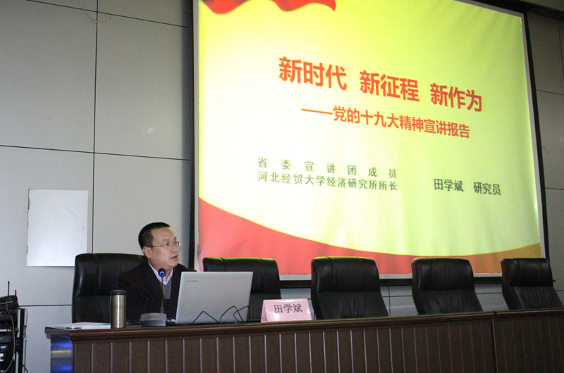 开班仪式后,省委宣讲团成员、河北经贸大学经济研究所所长田学斌以“新时代、新征程、新作为”为题,对党的十九大精神作了系统全面的宣讲:他从一名经济学家的专业视角,借助鲜活翔实的案例,以青年学生喜闻乐见的方式,进行形象生动的解读,让每一名青马学员印象深刻。宣讲既有高度、又有深度,学员们认真听、认真记,通过此次学习对十九大精神的理解更加透彻,信心更加坚定,工作更有干劲。现场气氛振奋、热烈。