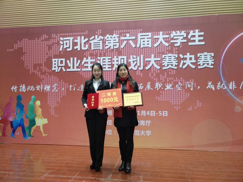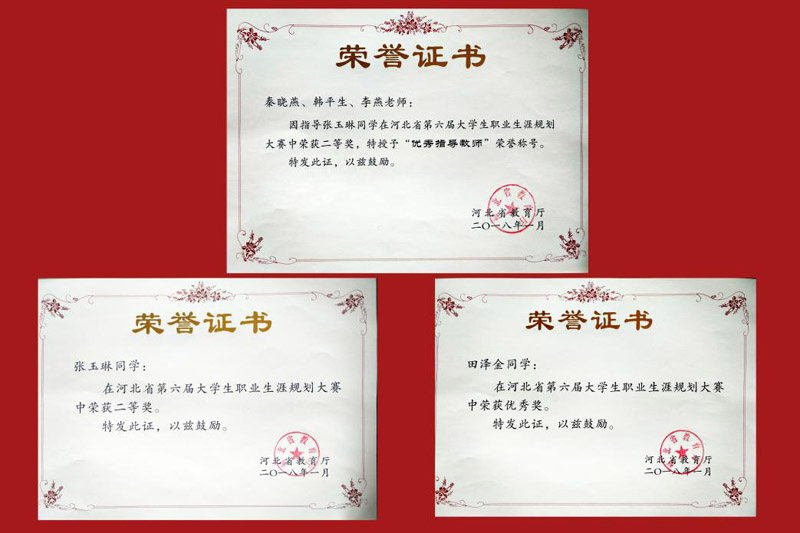 近日,省教育厅为在河北省第六届大学生职业生业规划设计大赛决赛上获奖的单位和个人颁发了奖状和荣誉证书。Beat365官网选手张玉琳荣获二等奖,田泽金获优秀奖,Beat365官网获优秀组织奖,秦晓燕、韩平生、李燕获优秀指导教师奖。