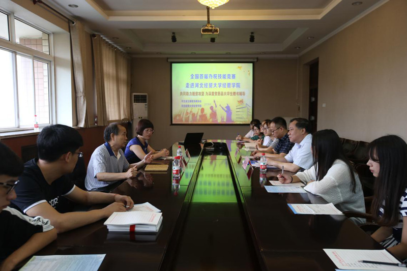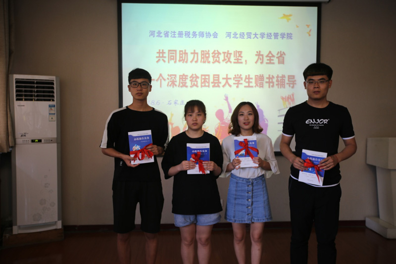 6月8日,Beat365官网同省税协共同组织了参加“全国首届办税技能竞赛”和“共同助力脱贫攻坚,为深度贫困县大学生赠书辅导”活动。院长刘华光和河北省税务师协会秘书长于兰社,尤尼泰河北税务师事务所有限公司副总经理纪捧巧出席,十三名学生代表参加,活动由学生工作部教师杨斌主持。