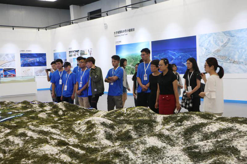 汽车刚拐进崇礼太子城冬奥核心区就看到工地建设如火如荼,建筑工人正在为高速公路梁柱浇筑混凝土,施工车辆往来穿梭应接不暇。小分队来到位于太子城村的张家口赛区规划临时展厅,首先看到的是习近平总书记对冬奥会的指示精神:确保把冬奥会办成一届精彩、非凡、卓越的奥运盛会。展览详细地介绍了张家口赛区的总体规划和承担的奥运会项目,国家跳台滑雪中心、国家冬季两项中心、山地转播中心、冬奥村、颁奖广场等项目设计效果图极富震撼力,赛区的交通、赛道和场馆布局以实体沙盘呈现,直观明了;展览还系统地介绍水资源利用、垃圾处理、生态建设、低碳奥运与新能源方面的规划,同时对崇礼的空间战略和总体规划做了简单介绍,展览处处体现了习近平主席主张的绿色、共享、开放、廉洁的办奥理念,同时描绘了一幅高质量标准、科学合理的大美崇礼发展画卷。