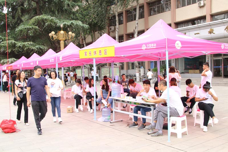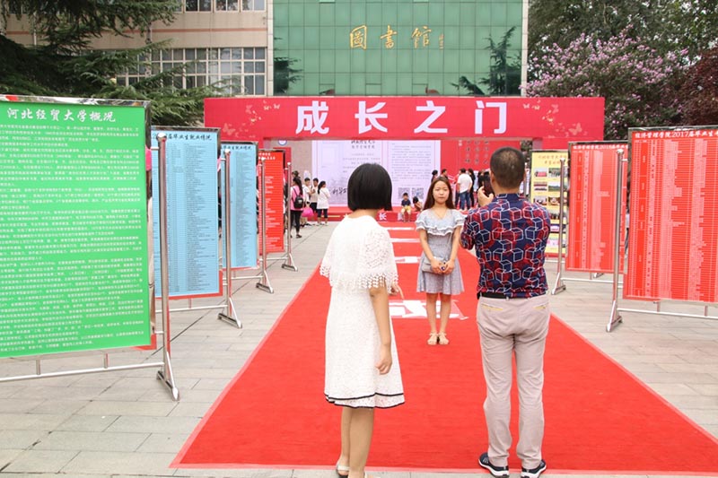 校园里营造出浓厚的迎新氛围,张贴了报到指示牌、校园平面图和安全提示,设置了家长休息区、公共饮水区和党员先锋岗;各系和户籍、后勤、校医院等相关部门布置了迎新帐篷、摆放了宣传展架,展示校园风采、介绍相关政策;印有“河北经贸大学经济管理学院录取通知书”的主题展板和“新生照片展架”引人注目,新生和家长们驻足寻找自己的或自己孩子的照片。今年,学院还专门制作了大红色的“成人之路”、“成才之门”和“成长舞台”等迎新景观,寓意着新同学们通过大学生活的历练,摆脱稚嫩、走向成熟,登上崭新的人生舞台,绽放出更加绚丽的人生光彩。新生和家长们纷纷踏上“成人之路”、穿过“成长之门”、走上“成长舞台”,在迎新景观处拍照留念,深切感受学院全体老师给予他们的殷切期待和美好祝愿。