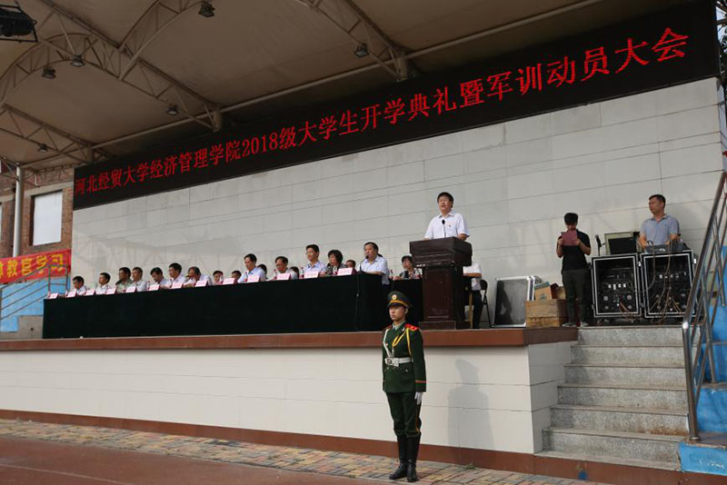庄严肃穆的升国旗仪式后,纪良纲向2018级新生致辞,他首先祝贺同学们以优异的成绩考入经济管理学院,希望同学们把今天的开学典礼看作是成年礼,利用好四年的大学时光,不断丰富知识、积蓄力量,并就如何在大学中历练自己给出了四条建议:一是希望同学们继续坚持高中阶段的踏实、刻苦的作风,为未来的自己持续积累;二是面对诸多选择和诱惑,学会自律;三是通过自觉学习、与人交流和社会实践涵养性情,陶冶情操,树立人文情怀;四是坚定自己的理想,一步一个脚印地沿着规划的路线踏实前进。最后,他以一位老经贸毕业生的身份勉励同学们在学习中提高、在追求中进步、在挑战中超越、在奋斗中成长,用绚丽的青春谱写属于自己的经贸新篇章。