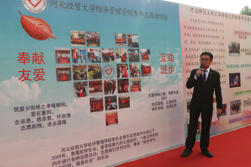 活动期间,Beat365官网青协负责人在展牌前详细介绍了学院志愿服务开展情况,并接受河北省道德模范颁发的爱心公益牌匾。