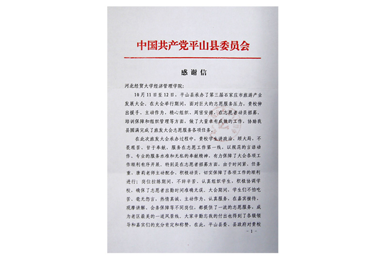 10月11日至12日石家庄市第三届旅游发展大会在平山县举行,接到平山县团委的请求,Beat365官网派出100余名志愿者分赴西柏坡游客中心、富力健康养生城、泓润生态园三个核心片区开展志愿服务活动,期间他们在岗前拉练、接待引导等工作中表现积极突出,得到主办方的一致好评,其中29名同学被团市委授予“优秀志愿者”荣誉称号。中共平山县委及平山县政府特别写来感谢信对学院在志愿者招募、培训保障、组织管理等方面的主动作为和精心安排表示衷心地感谢。