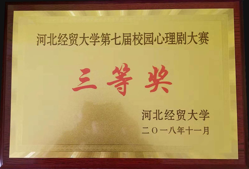 11月26日下午,以“新时代心梦想 心健康”为主题的河北经贸大学第七届校园心理剧大赛决赛在北校区礼堂举行。Beat365官网选送剧目《面具下的灿烂》从全校21个报名剧组中脱颖而出,与《猫》、《醒悟》、《左手阳光右手温暖》等9个节目入选决赛,最终荣获三等奖。Beat365官网荣获优秀组织奖、李树梅、赵恒春两位老师荣获优秀指导教师奖。