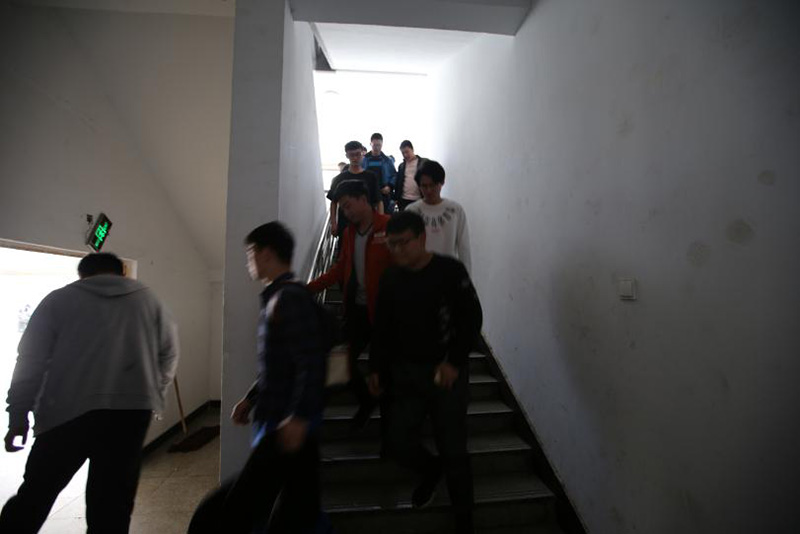 演练开始前,路士国首先简要介绍了演练流程和注意事项。1450分逃生演练正式开始,公寓楼哨声鸣响,根据演练方案组成的各个应急小组迅速进入工作状态,组织开展楼内学生进行疏散逃生。楼层引导员在紧急出口为疏散人群指引方向,并逐一检查每间公寓,确保所有学生按要求撤离;楼道口安保人员提醒学生以正确的姿势迅速逃生到指定位置;校医院医护人员提着急救箱氧气袋随时待命;各班辅导员在集合地点核实学生人数……在各小组的密切配合下,楼内800多名学生安全迅速有序地从1号公寓撤离,整个疏散逃生仅用时4分钟。