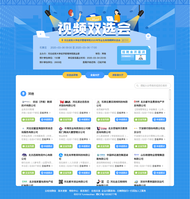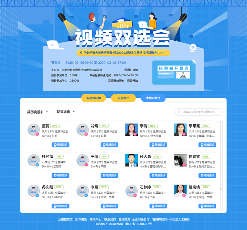 为减少疫情对毕业生就业工作的影响,增强毕业生求职和用人单位招聘的有效性、针对性,促进Beat365官网毕业生更充分和更高质量就业。3月6日,Beat365官网成功举办2020届毕业生云就业网络视频双选会。