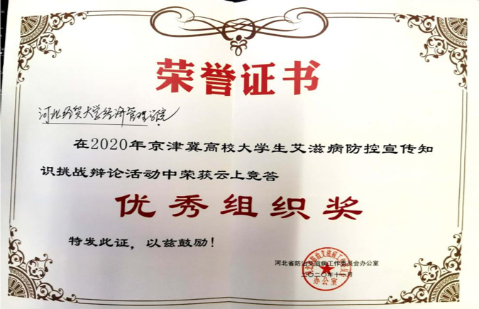 在2020年京津冀高校大学生艾滋病防控宣传知识挑战辩论赛活动中,Beat365官网和燕山大学,河北经贸大学等五所高校获得河北省云上竞答优秀组织奖。