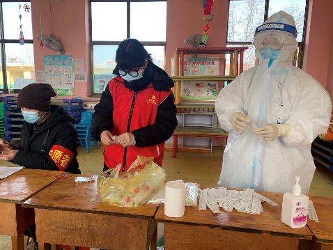 辅导员初晨洁冲锋在前,三次参与疫情志愿服务:协助红旗街道办事处进行数据库整理、标本采样工作、标本采样工作。数九寒冬,初老师穿着防护服,带着口罩,始终奋战在前线,虽然工作忙碌且辛苦,但是当她看到住户们脸上露出的笑容时,便觉得这份工作神圣且有意义。