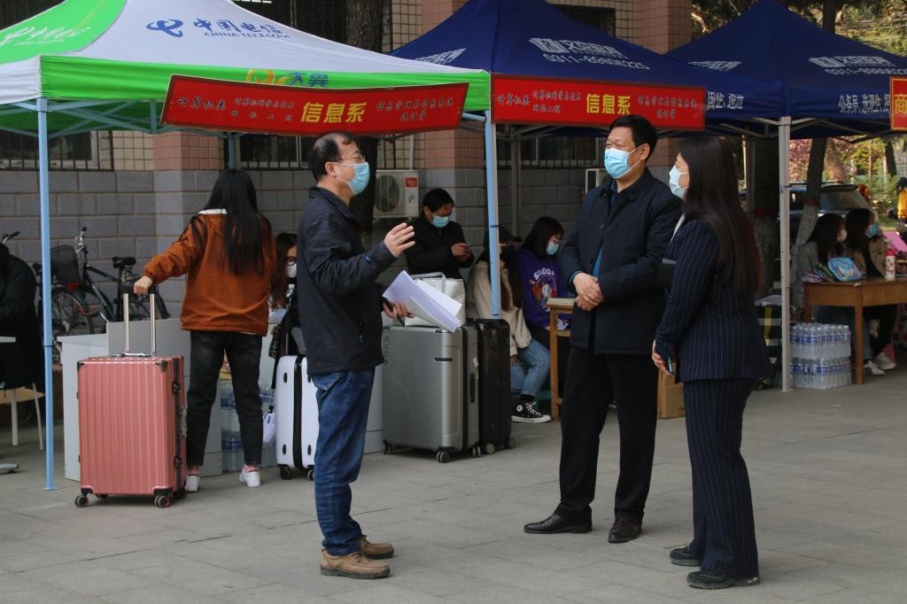 春风十里,我们在经管等你。一大早,学院领导班子,各系党总支书记,学院办公室、学生工作部、院团委、安全工作部、后勤保障部等相关部门负责人就来校园,实地查看学生返校情况,迎接慰问返校学生。