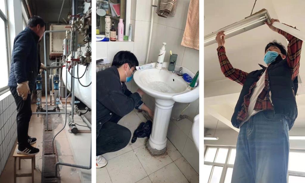 3月23日西校区食堂地下室库房管道漏水,维修人员搜寻漏点,最终发现下水道有问题,经过3个小时的维修终于堵住漏水口;3月25日,西校区水泵电机损坏,影响了整个校区的供水,电工师傅抢修供水电机,维护、更换、安装历时2天,他们克服困难,期间仅对校区停水1小时,师生的学习生活基本没有受到影响。3月28日上午,西校区食堂操作间暖气管崩裂暖气突然漏水,动力保障部门两位师傅接到任务后全力抢修,3个多小时后,漏洞被修补完毕。