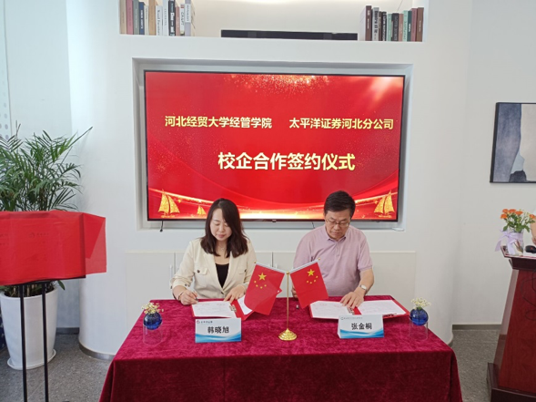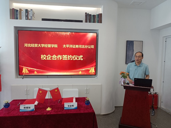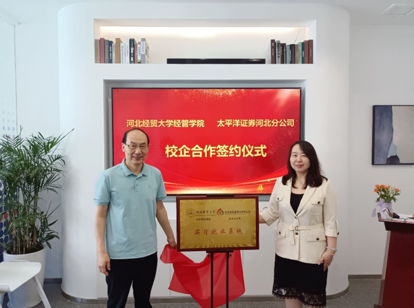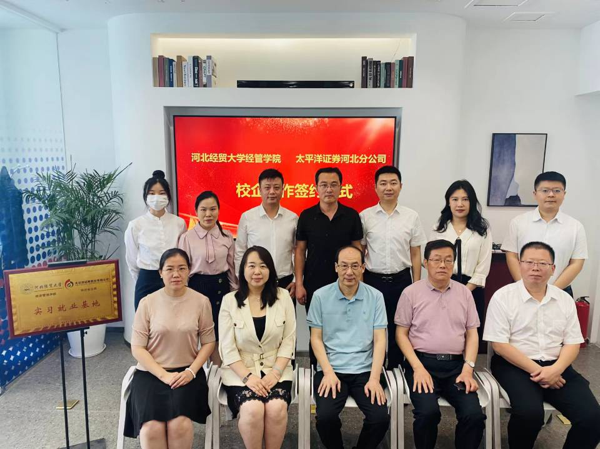 6月15日,河北经贸大学经济管理学院和太平洋证券股份有限公司河北分公司实习就业基地签约暨授牌仪式在太平洋证券河北分公司总部举行。学院党委书记马斌、副院长张金桐、太平洋证券河北分公司总经理韩晓旭、经济系党总支书记蔡杨、主任张瑞锋、副书记郑庆国和公司的相关部门负责人一同参加了本次活动。