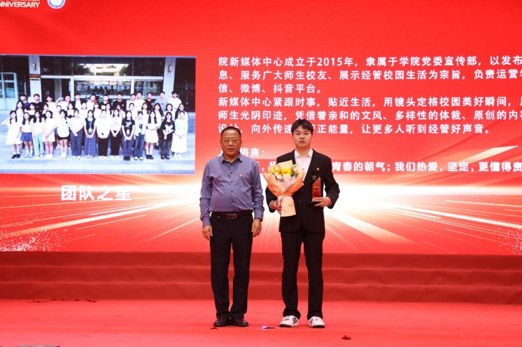 星光工程颁奖仪式是晚会中的重磅环节,众多优秀经管学子通过层层选拔,最终评选出经济之星李佳梦、管理之星刘旭、文法之星郭萌、信息之星马霖、商务之星陈博杰、会计之星肖逸婷,团队之星的桂冠由院新媒体中心摘得,现任小米通讯技术有限公司石家庄区域经理,2013级经济系国际经济与贸易专业学生李晓煜荣获了校友之星,育人之星授予经济系主任张瑞锋老师。到场的校领导和学院领导为获奖者颁发了奖杯。整场晚会在歌伴舞《领航》中缓缓落幕。