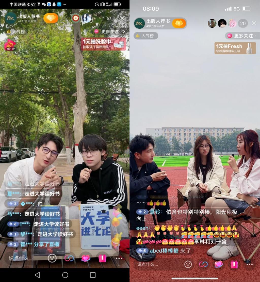在熟悉的校园里做直播,同学们既紧张又亲切,主持人轻松幽默的风格让同学们很快进入状态,同学们涉猎广泛,有的推荐世界名著《红与黑》、《复活》,有的推荐畅销小说《我与地坛》、《月亮与六便士》,有的推荐心理学经典《认知觉醒》《被讨厌的勇气》或者散文《雪落香杉树》《我从未如此眷恋人间》等等。直播互动的形式受到青年学生的喜欢,同学们在网上和嘉宾一起互动,在轻松的氛围下了解了书本的精华,化解了大学生活的困惑。