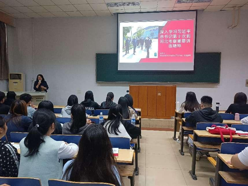 课上,李英教授以“深入学习习近平总书记第十次到河北考察重要讲话精神”为主题,以马克思主义基本原理、习近平新时代中国特色社会主义思想等科学理论为依据,对京津冀协同发展、雄安新区建设的重要意义、新时代我国自主创新发展进行了深入浅出的讲解,并用学生听得懂、学得会、用得上的知识为在场的同学呈现了一场专业知识理论与实践紧密契合的视听盛宴。