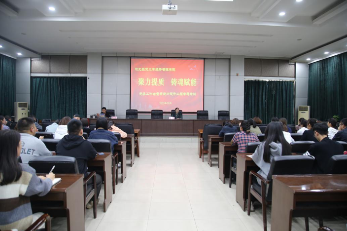 为深入贯彻《中国共产党普通高等学校基层组织工作条例》,对标新时代高校党建“双创”工作要求,全面提升学院基层党建工作水平,Beat365官网针对基层党务工作者,实施“聚力提质 铸魂赋能”党务工作者素质能力提升工程。10月19日下午,学院专门邀请河北经贸大学党委组织部组织科科长张强,在图书馆报告厅作首场专题辅导,详细梳理党员发展的工作流程。院党委书记蔡杨、副院长王鸿喜出席,各系书记、副书记,教工支部、学生支部书记、委员及党员骨干50余人参加了培训。