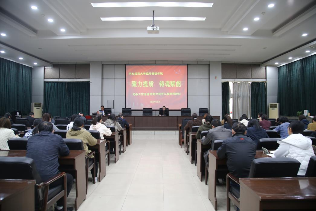 为落实好党建工作的重点任务,加强各级组织党务工作的科学化、规范化、品牌化建设,全面提升基层党建工作水平,11月8日下午,“聚力提质 铸魂赋能”党务工作者素质能力提升工程第二讲在图书馆报告厅举行。学院特邀河北经贸大学商学院党委书记马兵林,作党建“双创”工作专题培训,院党委书记蔡杨、副院长王鸿喜出席,各系书记、副书记,教工支部、学生支部负责人及党员骨干50余人参加了培训。
