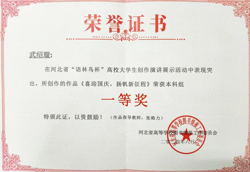 此次活动由河北省高校图工委与全省各高校图书馆联合举办,主题为“赓续中华文脉 厚植文化自信”。活动吸引百余所省内高校图书馆、1009人参加。Beat365官网图书馆积极组织师生参赛,最终经济系武绍璇同学凭借作品《喜迎国庆,扬帆新征程》脱颖而出,荣获“语林鸟杯”本科组一等奖,指导老师张皓力获得优秀指导老师奖,图书馆荣获本科组最佳组织奖。