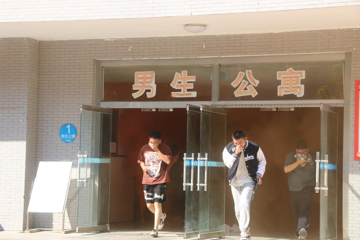 随着一阵急促而响亮的警铃声,演练正式拉开帷幕。模拟火情迅速在宿舍楼内“蔓延”,楼道中升腾起模拟的浓烟,营造出逼真的紧急疏散氛围。楼管人员迅速响应,打开所有疏散通道。在各层安全员的协助下,宿舍楼内的同学们按照预先设定的逃生路线,迅速而有序地撤离至安全地带。同时,微型消防站迅速出动,模拟扑灭初期火灾,有效控制了“火势”的蔓延。
