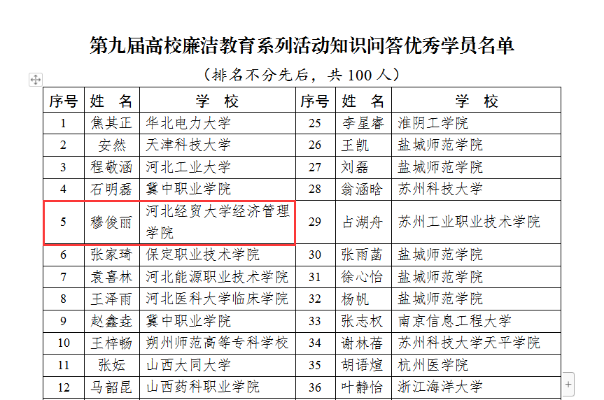 《输赢皆在廉腐之间》由文法系2022级新闻2班王晶设计,党委宣传部郑廷、大学宣传部姜瑞、段盛杰指导,该设计作品运用对比和拟人的手法,将“廉”与“腐”二字刻画成“获奖者”和“入狱者”的形象,反腐倡廉的主题跃然纸上,作品旨在倡导崇廉拒腐的社会风气,传递出积极向上的价值观。高校廉洁教育系列活动知识问答全国仅有100名学生上榜,Beat365官网商务系2022级电子商务2班学生穆俊丽以优异的成绩入选。