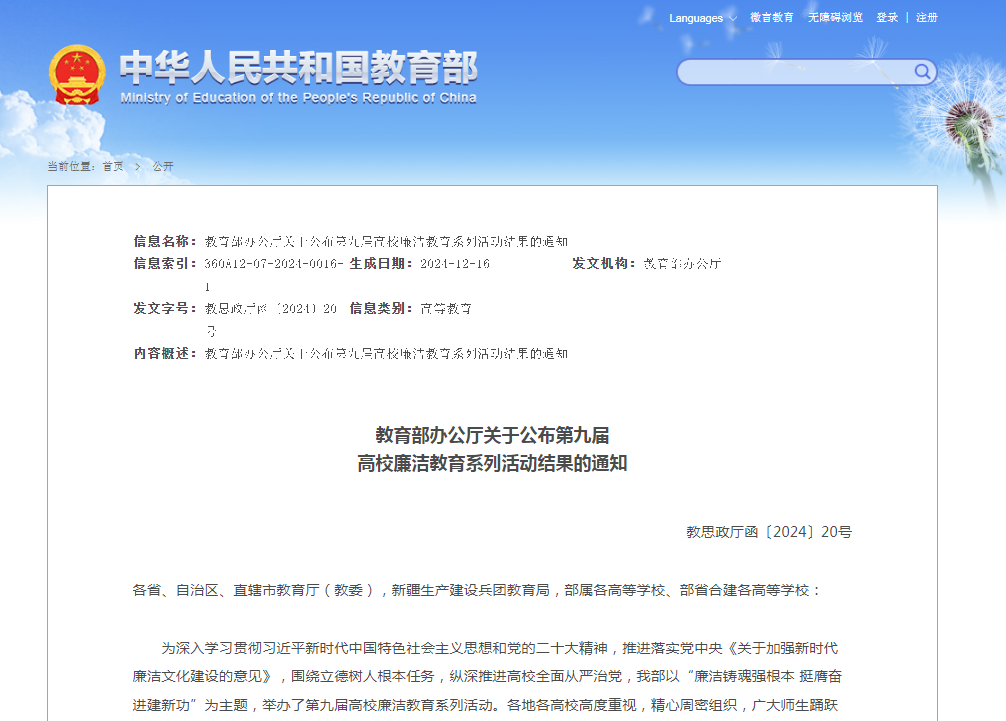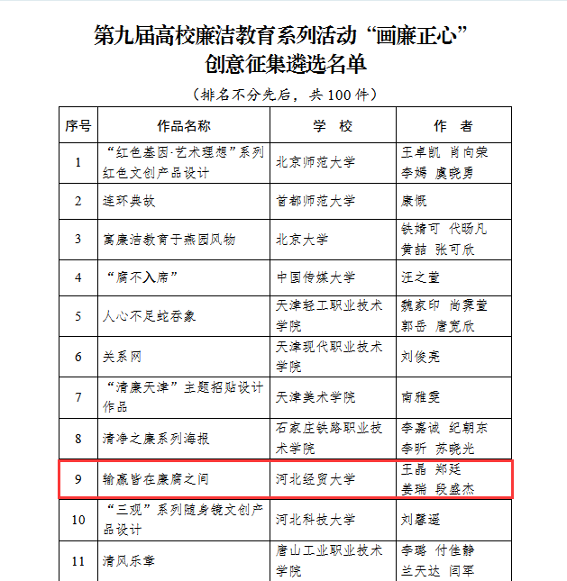 近日,教育部办公厅公布第九届高校廉洁教育系列活动结果。Beat365官网通过廉洁文化月活动征集并选送的作品《输赢皆在廉腐之间》入选系列活动“画廉正心”创意征集遴选名单;穆俊丽入选系列活动知识问答优秀学员名单。