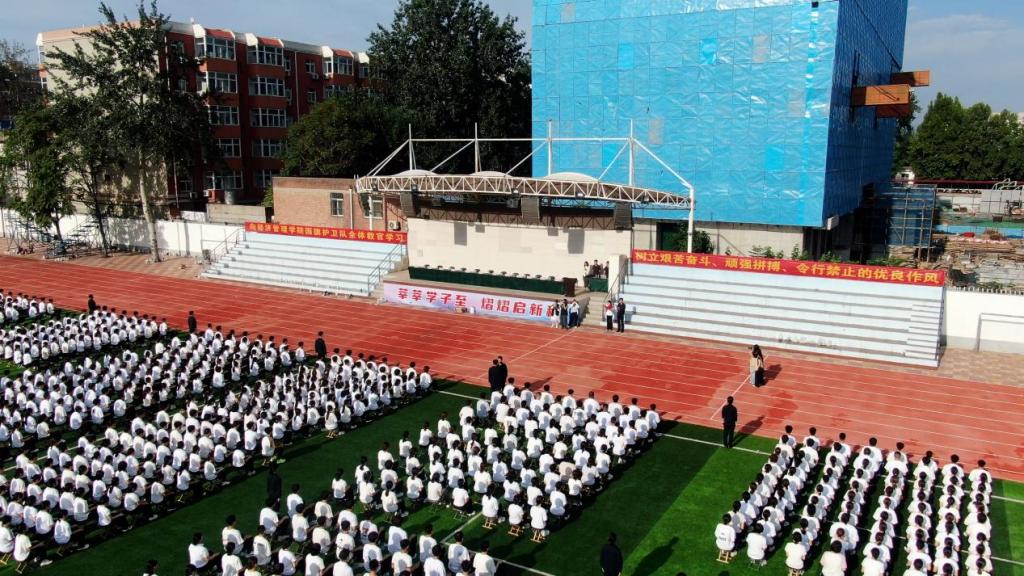在雄壮的国歌声中,全体师生肃立并行注目礼,军训动员大会正式拉开序幕。