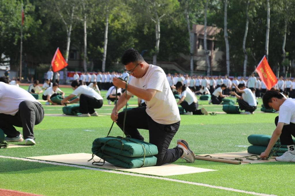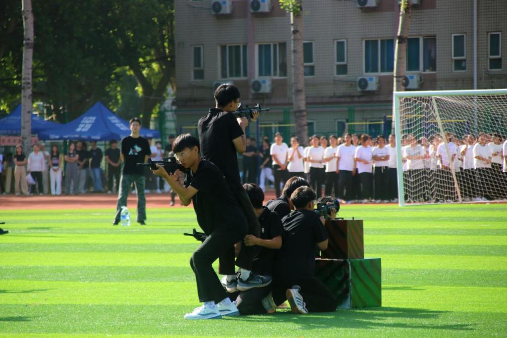 在军训科目表演环节,各连队依次呈现武警擒敌、军魂铸被、旗语、战术演练、刺杀操、匕首操等特色项目。“军魂铸被”方队借助无人机垂挂条幅“忆往昔,抗战精神燃热血,铸军魂强志笃行;看今朝,经管学子展宏图,启新程奋楫扬帆”,并通过一套干净利落的叠被表演拼出“80”字样,致敬抗战胜利80周年;“战术演练”方队成为全场焦点,同学们持枪冲入“硝烟”,翻越障碍,完成突进、匍匐、射击等一系列动作,轻捷精准、配合默契,展现出良好训练素养;“刺杀操”方队气势如虹,灵活协调,彰显出青年学子的蓬勃朝气。同学们英姿飒爽、精神饱满,精彩呈现了两周军训的丰硕成果。