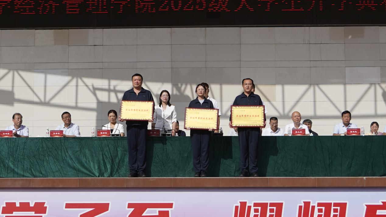 与会领导为军训工作中表现突出的代表和单位颁奖。商务系、经济系、信息系获“军训最佳科目表演奖”;商务系、会计系、文法系获“军训工作优秀组织奖”;管理系、经济系、信息系获“军训工作先进单位”称号;18名教职工获评“军训工作先进个人”,34人被授予“优秀教官”称号,126名新生获2025级“大学生军训标兵”称号。