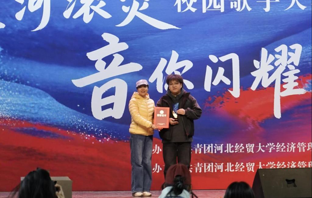 比赛中,选手演唱风格多样,情感真挚,充分展现了当代大学生的艺术素养与青春风采。大学生艺术团的伴舞与情景演绎也为舞台增色不少,营造出浓厚的艺术氛围。最终,24级经济系金融科技一班的刘晨阳凭借一首《落叶归根》的深情演绎摘得桂冠;23级商务系贸易经济二班的王海清以《同手同脚》温暖演绎荣获亚军;25级商务系数字经济一班的史皓然则凭《普通朋友》的出色表现获得季军。