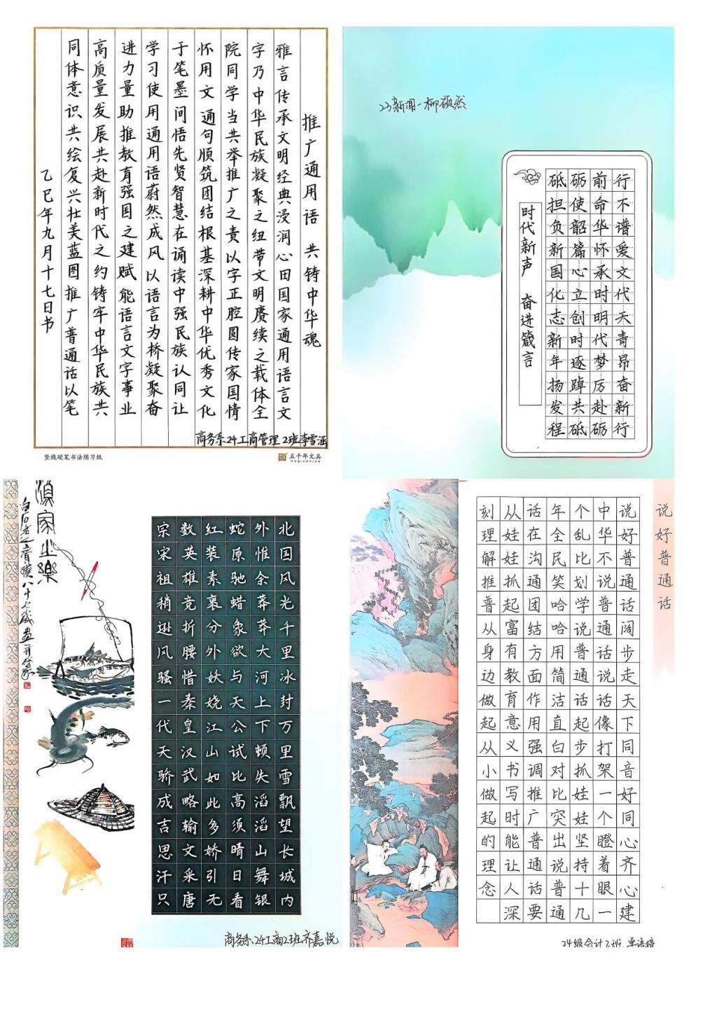 本次系列大赛由教务部、宣传部、学工部、团委及各系联合主办,参赛选手们各展所长,用多样形式诠释语言文字之美与家国情怀。中华经典诵读组中,选手通过录制音频或视频作品,以标准的普通话、饱满的情感诵读经典诗文;书法组,选手书写优秀诗文、爱国名言,字迹工整、设计精美,尽显中华文字的韵味;手抄报组,以纸张为载体,将主题与创意结合,形式丰富多样,既展现青春活力,又传递语言文化内涵。