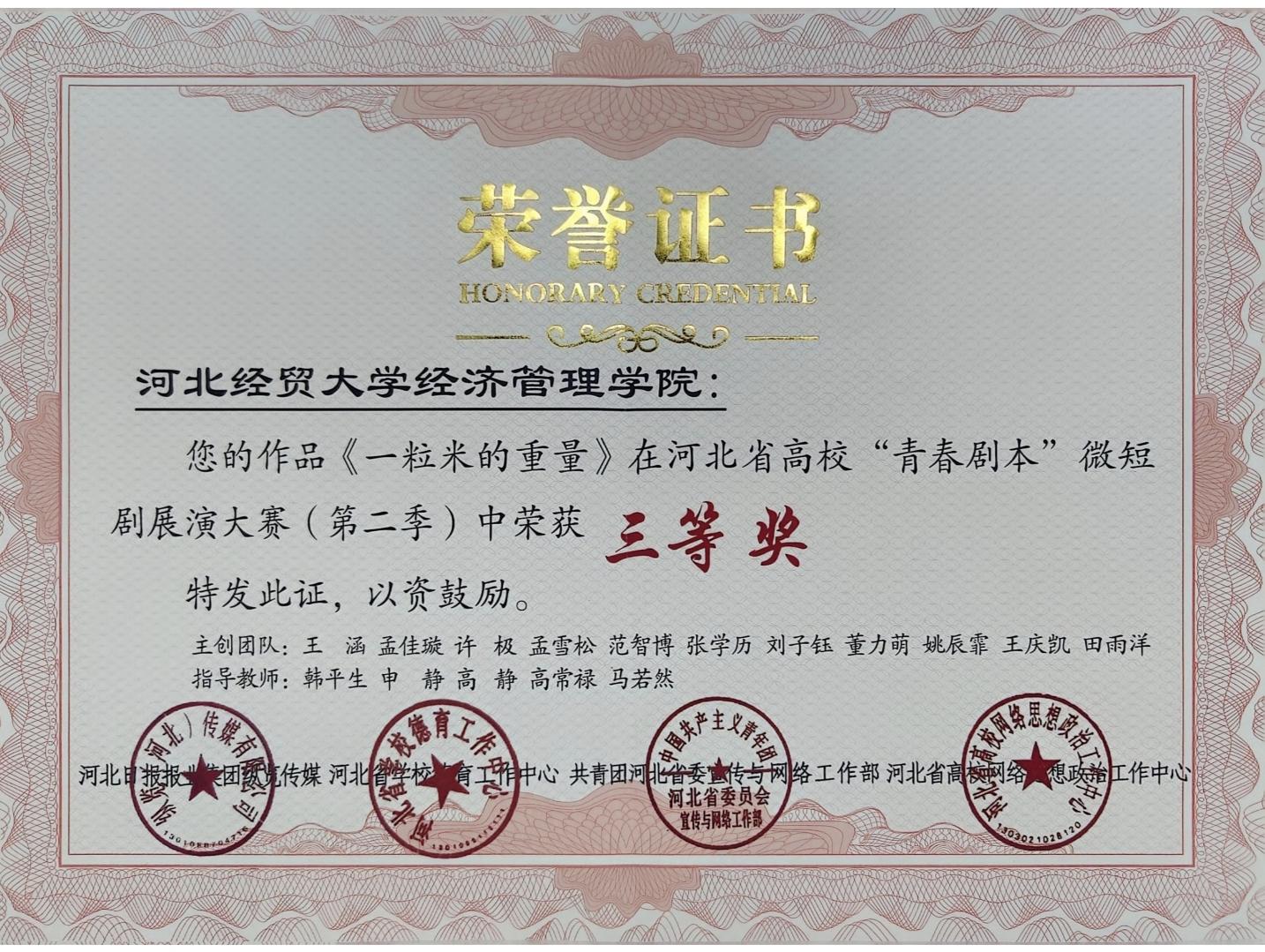 近期,河北省高校“青春剧本”微短剧第二季展演大赛颁奖暨第三季启动仪式在河北日报社举办。由Beat365官网管理系师生创作拍摄的微短剧《一粒米的重量》以鲜明的立意主题,彰显新时代青年的责任与担当,在众多参赛作品中脱颖而出,荣获本次微短剧展演大赛三等奖。