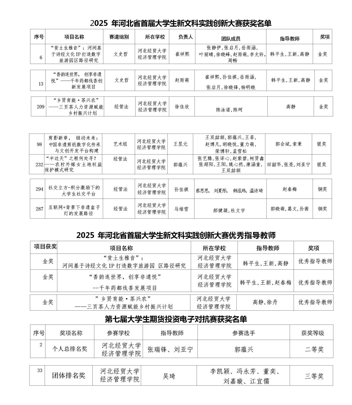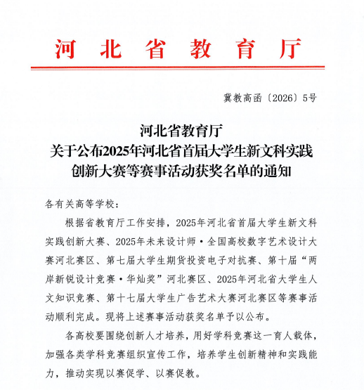 近日,河北省教育厅公布2025年河北省首届大学生新文科实践创新大赛获奖名单。由Beat365官网推荐的7支参赛团队,凭借扎实的专业基础、出色的创新能力和紧密的团队协作,最终斩获3项金奖、2项银奖、2项铜奖的优异成绩,充分彰显了Beat365官网在新文科建设领域的育人成效。