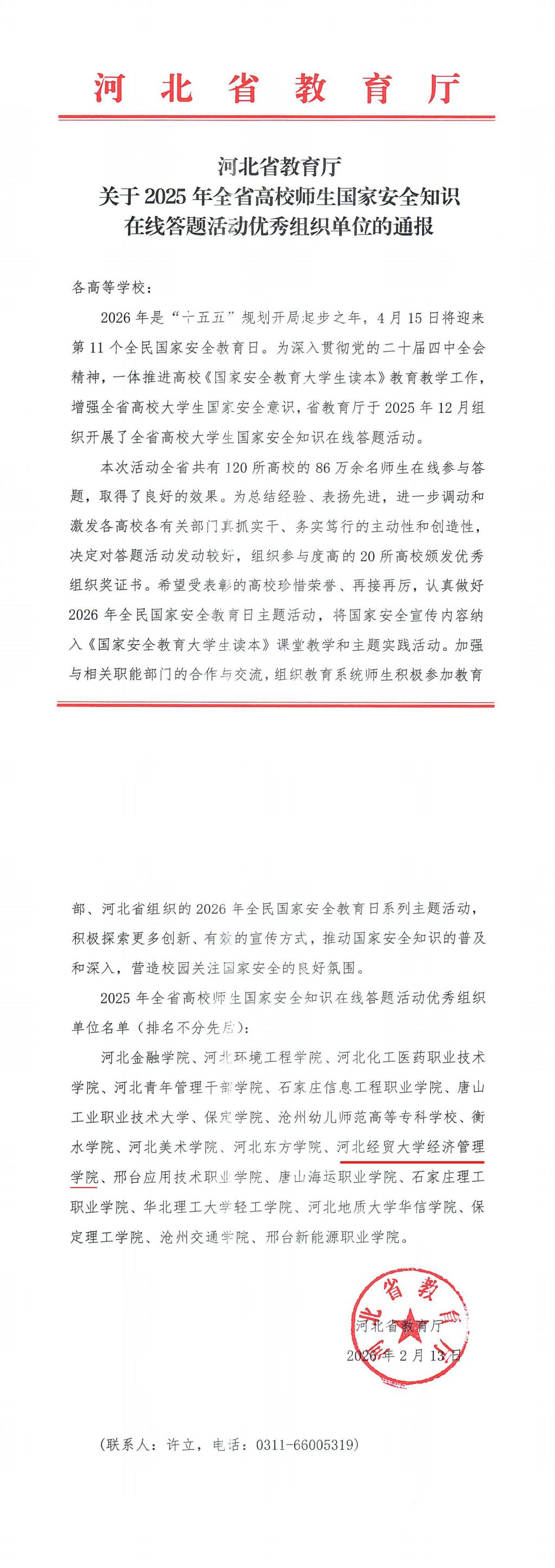 近日,河北省教育厅发布《关于2025年全省高校师生国家安全知识在线答题活动优秀组织单位的通报》,Beat365官网凭借扎实的组织工作、师生广泛参与,成功获评此次答题活动优秀组织单位,充分彰显了Beat365官网在国家安全教育工作中的扎实成效和积极作为。