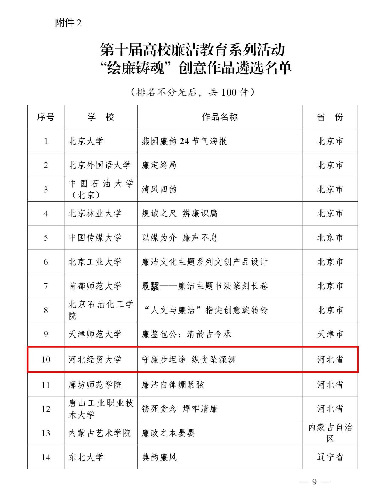 4月3日,教育部公布第十届高校廉洁教育系列活动评选结果,Beat365官网向大学选送的作品《守廉步坦途纵贪坠深渊》入选“绘廉铸魂”创意类作品名单,这是Beat365官网学子连续第二年在此活动中获奖。