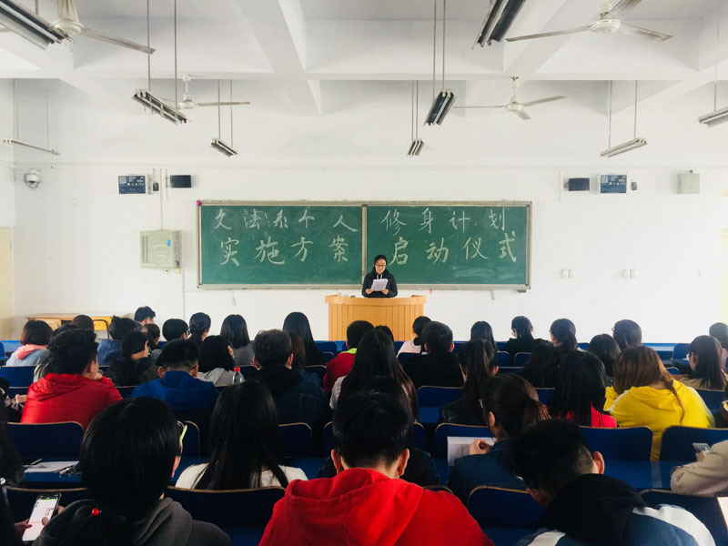 2018年4月9日,文法系在二教118教室举行了“大学生个人修身计划实施方案”启动仪式。活动由党务秘书徐丹主持,党总支书记高维林出席并讲话,文法系全体辅导员和各班学生干部、团支部成员、党员和入党积极分子参加了启动仪式。