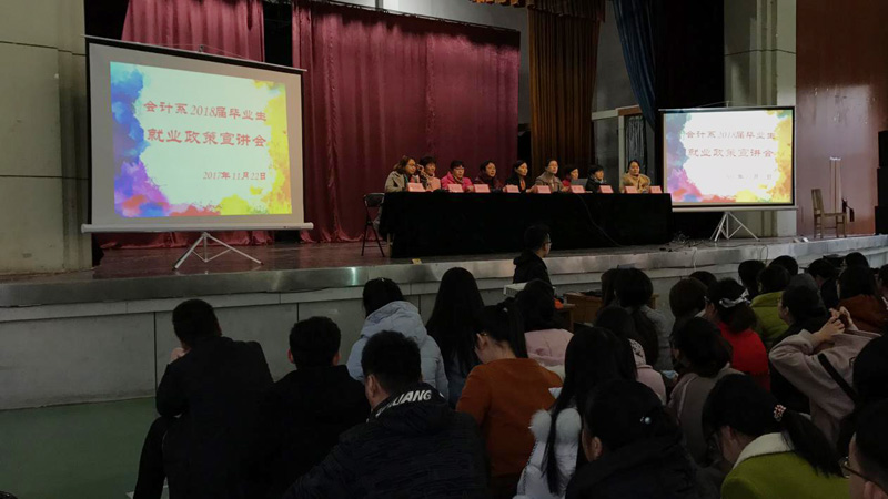 为了增强毕业生的就业意识,进一步落实就业政策,会计系于2017年11月22日下午在南院礼堂举办“2018届毕业生就业政策宣讲会”。学院就业部副部长胡党育、系党总支书记蔡杨、系主任王慧霞、毕业班的辅导员及全体毕业生参加了此次活动。