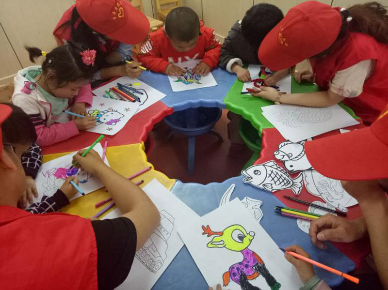 石家庄七彩阳光幼儿园大部分是有听力障碍的孩子,活动前期,志愿者们通过微信、微博等平台进行宣传,并认真安排核对活动流程。该活动将参与的三个班级分为三种活动主题模式,在以“动物总动员”为主题的豆豆班,志愿者们带着孩子们一起搭积木,合唱《幸福拍手歌》;以“智慧自然”为主题的甜甜班,志愿者们和孩子们一起拼七巧板,一起捏橡皮泥;在以“童话小天地”为主题的朵朵班,志愿者们手把手教孩子们折纸鹤、叠宝塔,还给孩子们表演了生动形象的手偶剧。志愿者用爱心和行动拉近了与孩子们的距离,为孩子们送去了快乐。